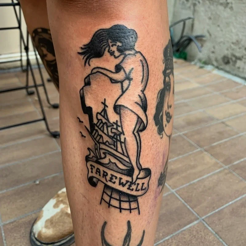 Tattoo of a woman with long hair leaning on a ship, with the word "Farewell" in a scroll beneath