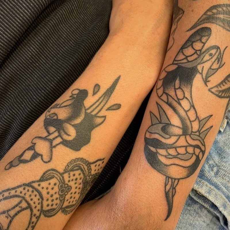 Two forearms with black tattoos, one depicting a dagger piercing a rose and the other showing a coiled snake.