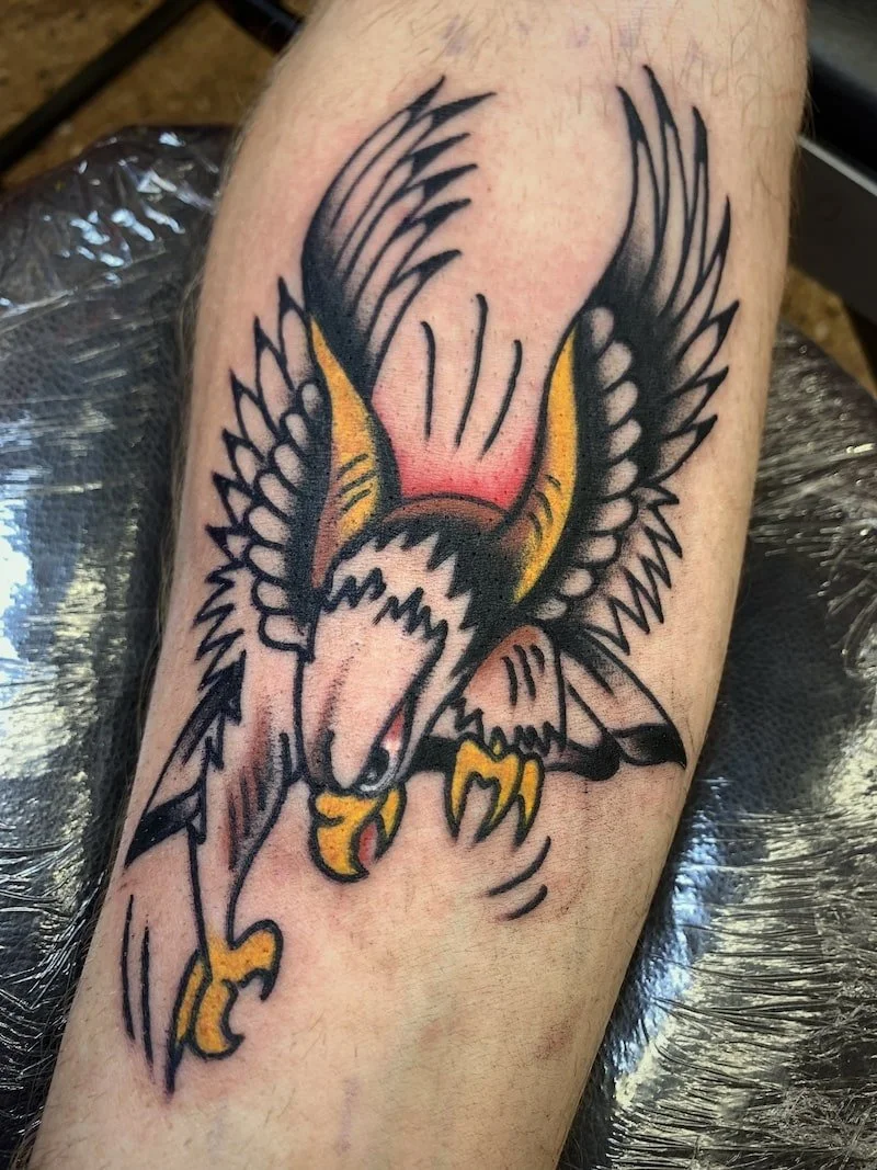 Traditional-style eagle tattoo with bold colors and outline, shown on skin.