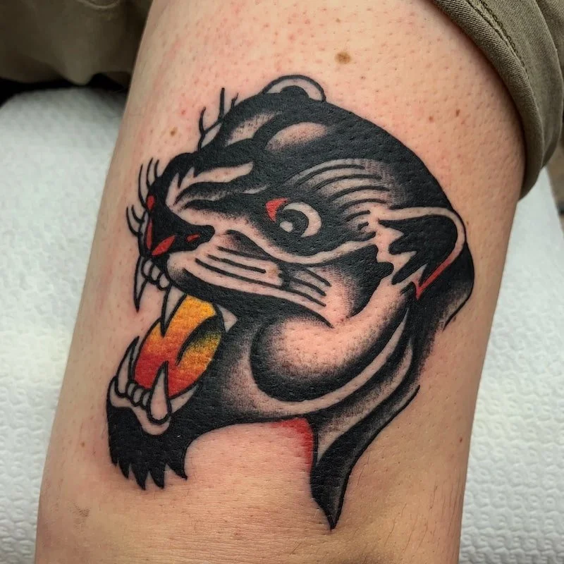 Traditional style tattoo of a black panther head with open mouth, showcasing fangs and a fiery orange and red tongue on skin.