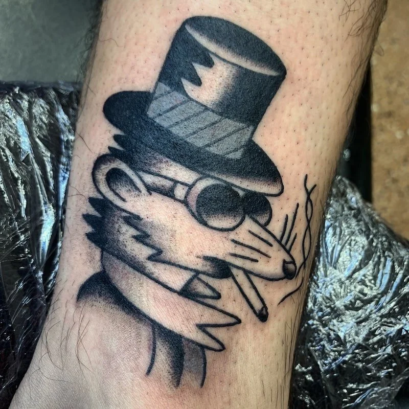 Tattoo of an anthropomorphic rat wearing a top hat, sunglasses, and smoking a cigarette.
