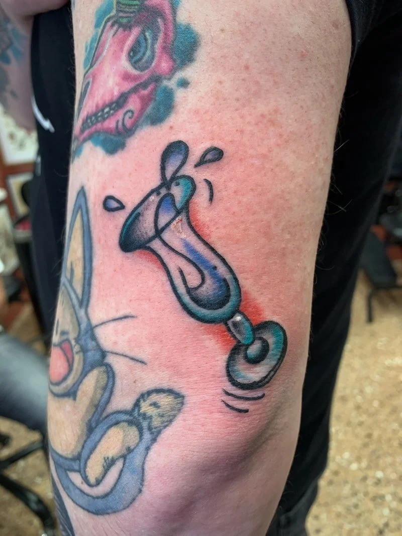 Tattoo on arm featuring an abstract design with bright colors and bold outlines, including elements such as splashes and motion lines.