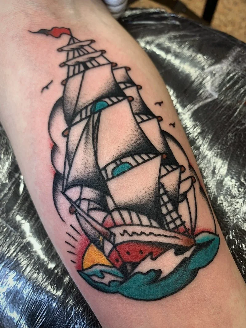 Tattoo of a traditional sailing ship with sails and ocean waves, featuring a sun setting in the background, on skin.