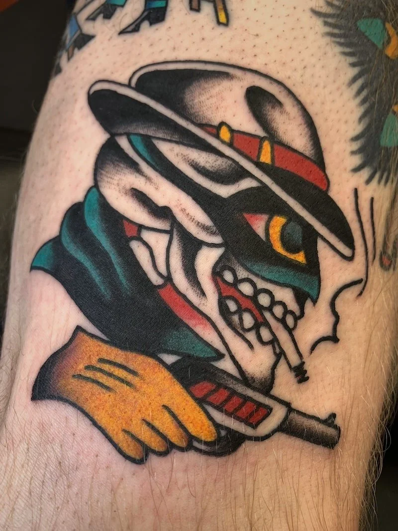 Tattoo of a stylized skull wearing a fedora, holding a smoking gun, with a cigarette in its mouth, colorful design