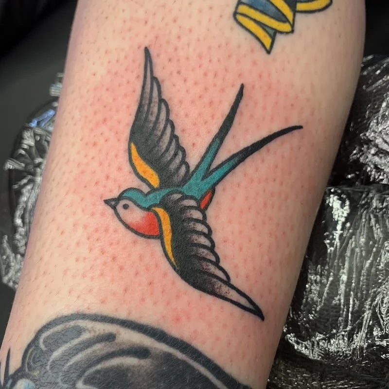 Tattoo of a colorful swallow with open wings on skin, featuring blue, yellow, and red accents.