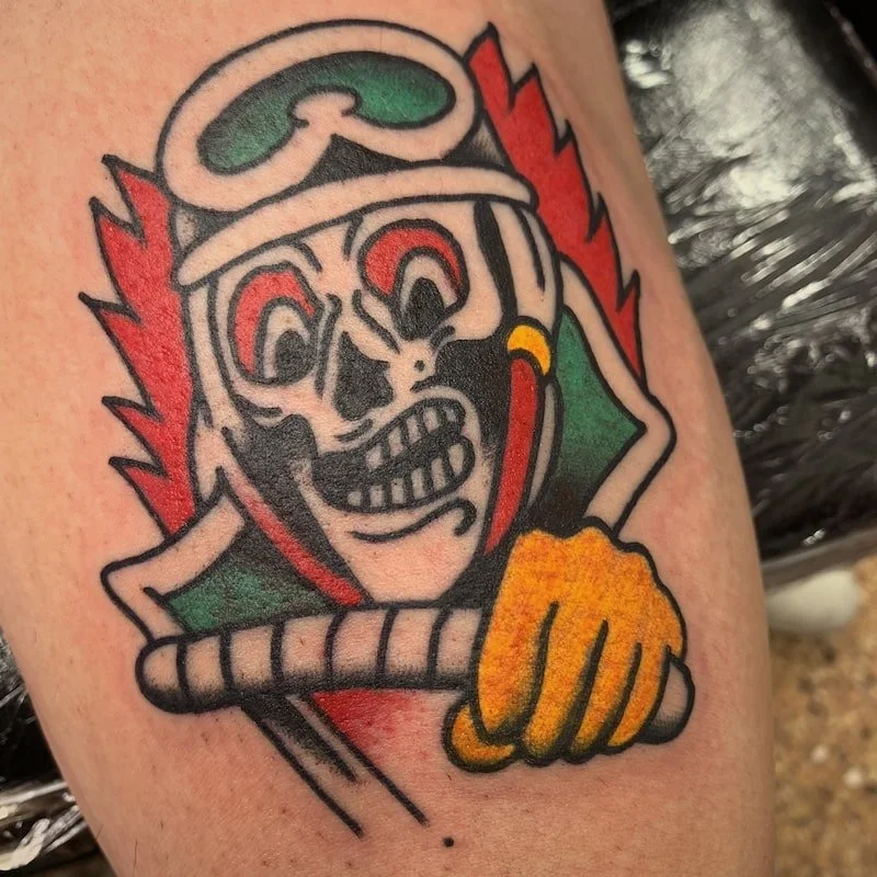 Tattoo of a skull wearing a helmet and goggles, holding a stick or club, with red and green accents.