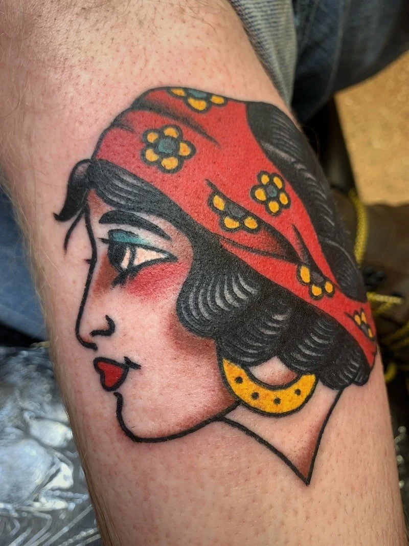 Old school tattoo of a woman's face in profile with a red headscarf and yellow hoop earrings.